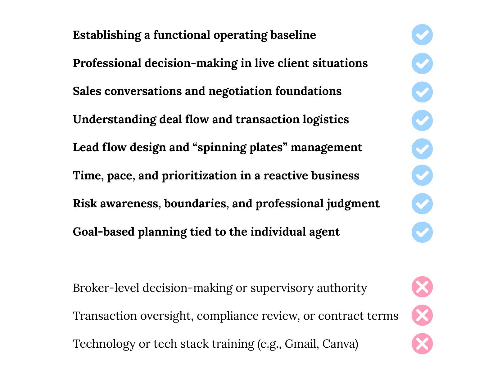 Business-First: Training is anchored in operating a real estate business; managing time, goals, responsibility, risk, and client relationships.