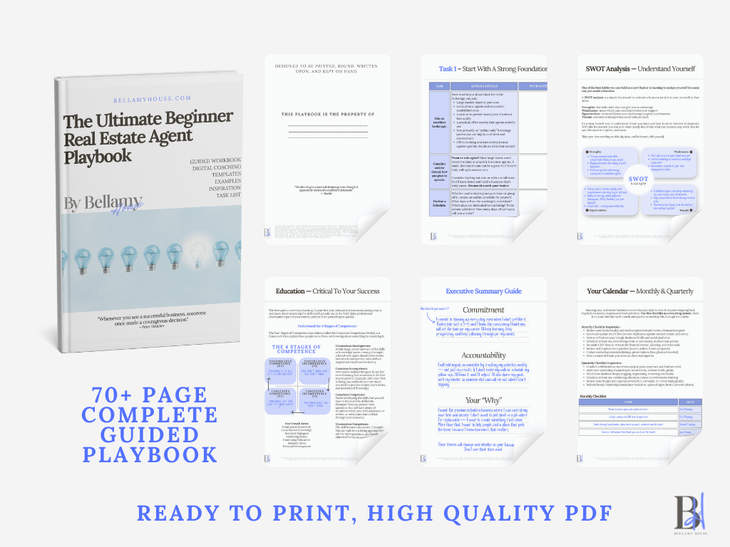 The Ultimate Beginner Agent Playbook is included for all Bellamy House Members. Full Members can access the free download below, as well as access the entire suite of Bellamy House products. To become a Full Member, visit the membership page.