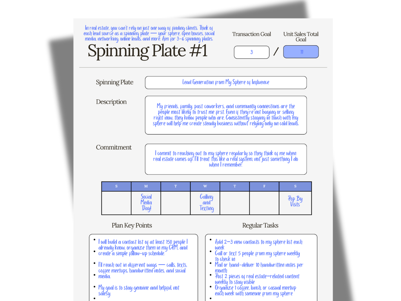 Lead Sources (“Spinning Plates”)—Choose 3–6 ways you’ll consistently generate business (social media, open houses, referrals, etc.) and outline how you’ll maintain them.