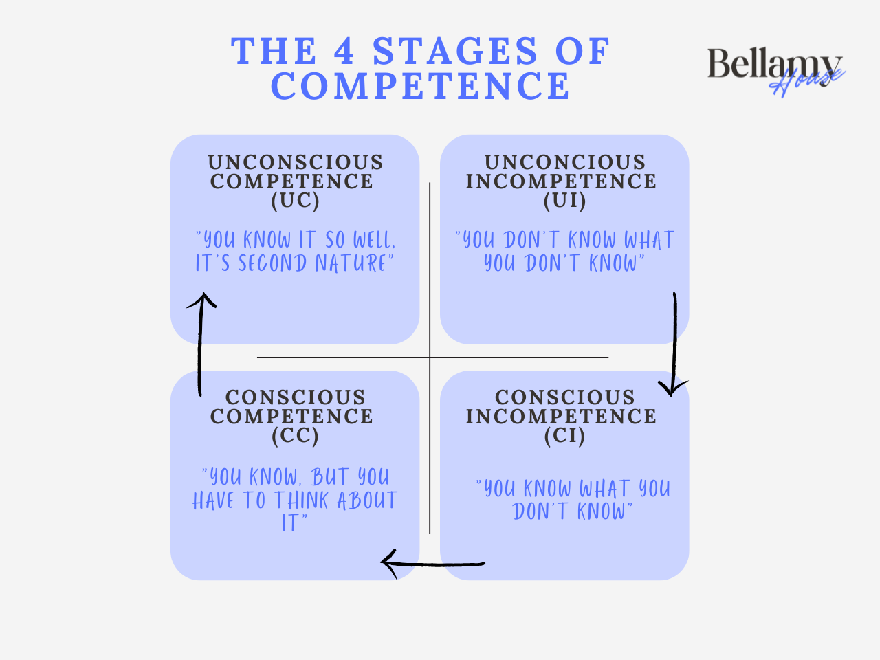 The Four Stages of Competence (sometimes called the Conscious Competence Model), is a framework that explains how people move from not knowing about something to mastering it.
