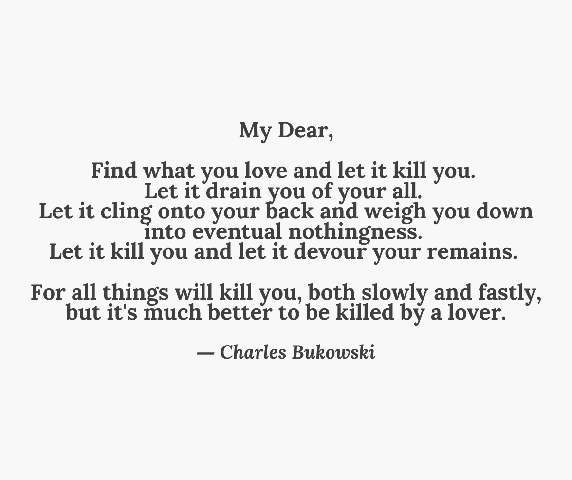 Find what you love and let it kill you. Let it drain you of your all. Let it cling onto your back and weigh you down into eventual nothingness. Let it kill you and let it devour your remains. For all things will kill you, both slowly and fastly, but it's much better to be killed by a lover.”