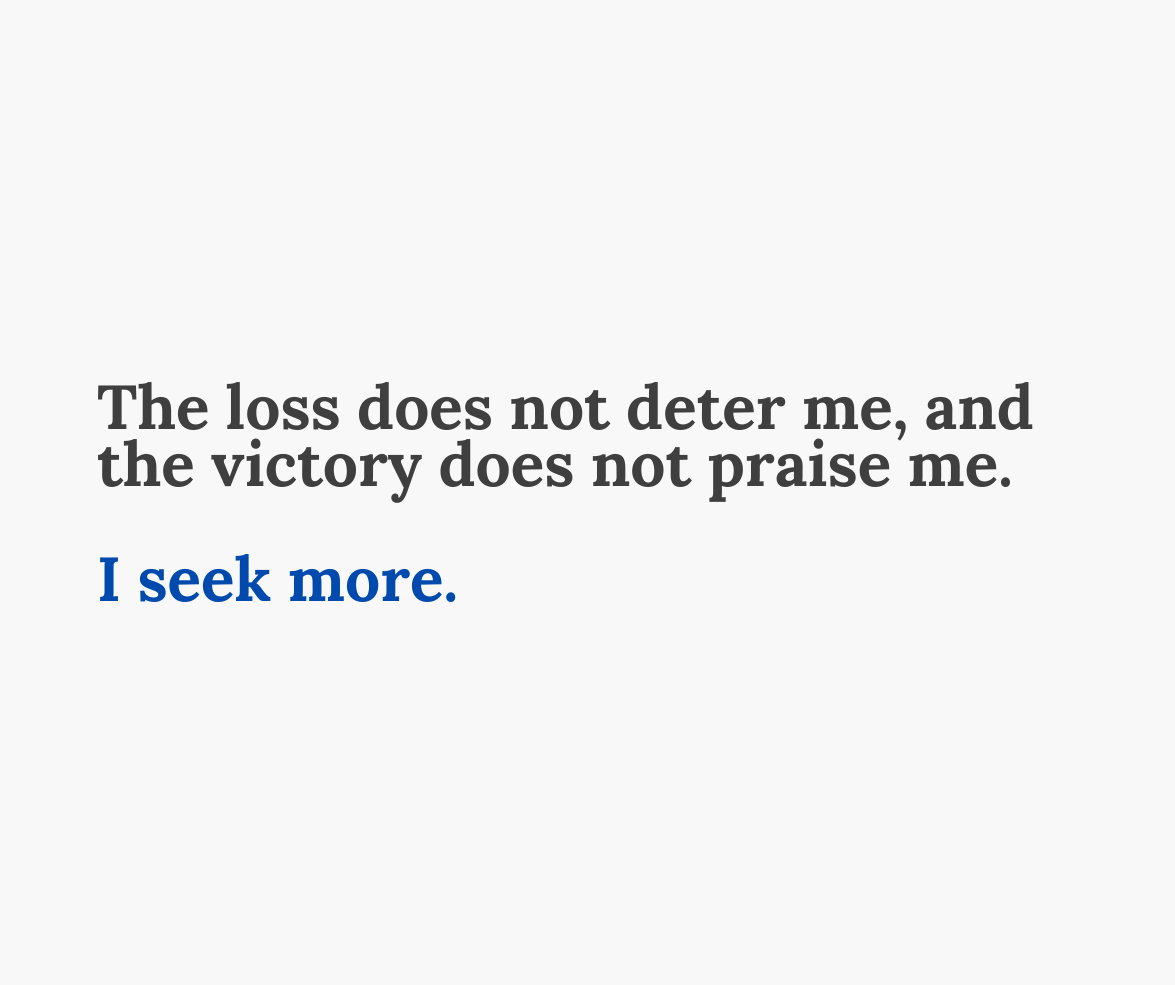 The loss does not deter me, and the victory does not praise me. I seek more.